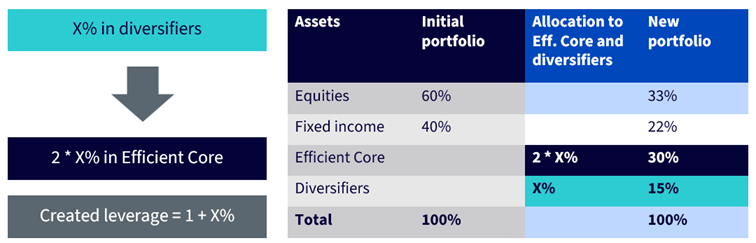 Für jede Allokation von 10 % in Eurozone Efficient Core schafft die Strategie in einem Portfolio einen Spielraum von 5 % für die Allokation in Diversifikatoren. Das heißt, für jede Allokation von X % in Diversifikatoren sollten Anleger doppelt so viel, also 2*X %, in Eurozone Efficient Core investieren. Wenn das Ziel beispielsweise wie in Abbildung 3 in einer Allokation von 15 % in Diversifikatoren besteht, sollten Anleger 30 % in Efficient Core einsetzen. Das bedeutet, dass die aktuellen Portfoliobestände um 15 % (Allokation in Diversifikatoren) + 30 % (Allokation in Eurozone Efficient Core) = 45 % reduziert werden müssen, also um das Dreifache der gewünschten Allokation in Diversifikatoren, d. h. 3*X %. Damit verbleiben 55 % bzw. 100 % – 3*X %, die direkt zwischen Aktien und Anleihen aufgeteilt werden, die das ursprüngliche Portfolio bildeten. Das verbleibende Engagement in Aktien und Anleihen entsteht durch die Allokation in Efficient Core. Der durch die Strategie geschaffene Hebeleffekt entspricht dann 1 + X % (der gewünschten Allokation in Diversifikatoren) bzw. 1,15 im Beispiel in Abbildung 3.