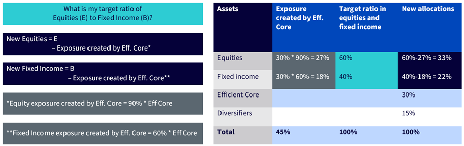 Für jede Allokation von 10 % schafft Eurozone Efficient Core ein Engagement von 9 % in Aktien aus Industrieländern des Euroraums und ein Engagement von 6 % in europäischen Staatsanleihen über Futures. In Abbildung 4 besteht das Ziel darin, das ursprüngliche Verhältnis von 60:40 beizubehalten, sodass die Reduzierung der Aktien- und Anleihepositionen dem angestrebten Engagement in Aktien und Anleihen abzüglich des jeweiligen Engagements durch Eurozone Efficient Core entspricht.